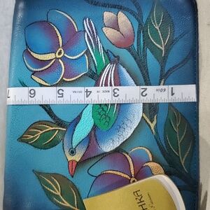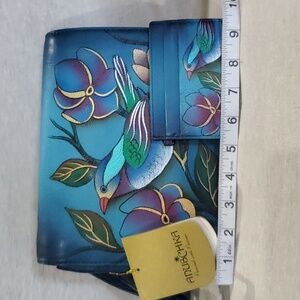 new with tags little bird floral handpainted leather crossbody flap over 3 interior pocket with matching card holder and dust bag by anuschka