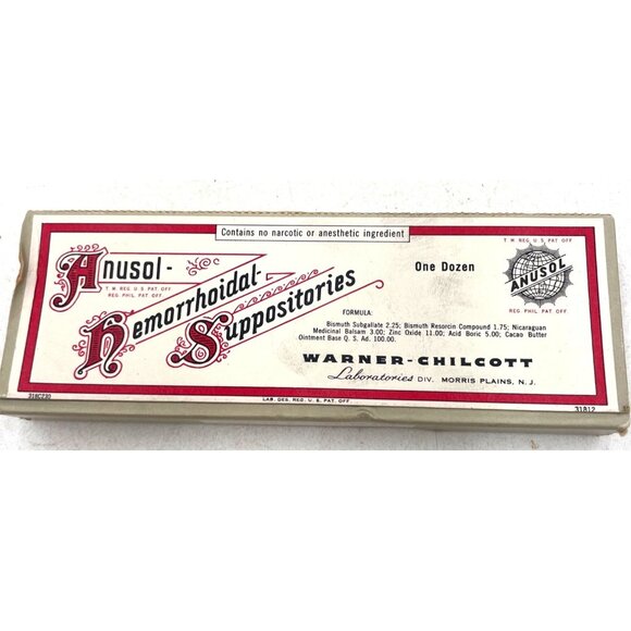 A relic from the past, this vintage Anusol suppositories box from Warner-Chilcott showcases historical packaging design and medicinal practices.