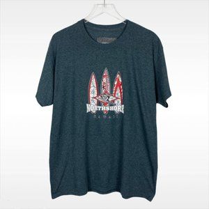 Anvil North Shore graphic short sleeve t-shirt. Blue gray with surf board graphic on front. Crew neck. Fabric: 50% Cotton; 50% Polyester. In great used condition. Color may vary with lighting or device.