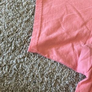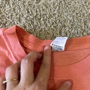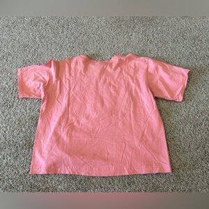 Coral short sleeve tee with cityscape graphic. Comfortable and stylish for everyday wear.