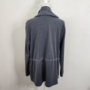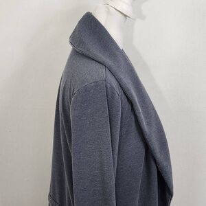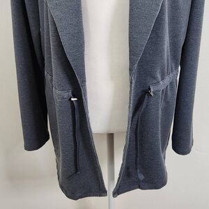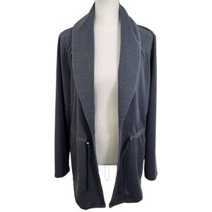 AnyBody knit open front jacket. Features tunneled waist drawcord with stoppers, long sleeves, and pockets. Color is a washed gray-blue color called Blue Night. Great condition!