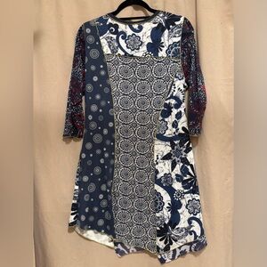 Anya AF tunic, hand made in the USA. Size M, shades of blue measures 35 inches from back collar to bottom of the tunic measures 17 1/2 inches at the waist from side to side.