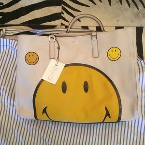 Anya Hindmarch leather large size Smiley face bag. Added two extra Anya Hindmarch smiley face stickers purchased separately brand new with authenticity cards and sleeper bags apprx 16 inches across snaps on sides to add extra room sold out