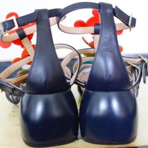 Main body is navy. Shoe Size EU 35. Buckle closure, geometric leatherwork detail across, point toe, embossed Anya Hindmarch logo. Composition: leather upper, lining and soles.