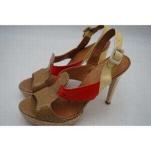Pre-owned without tags or box Anya Hindmarch London Color Block Patent Leather Platform Strap Heel Size 10/4. Stylish women's high-heeled sandals. The heels are stiletto-style with a glossy, cream-colored finish. The sandals feature multiple straps in different colors: a shiny beige/cream strap with a large, square off-white buckle, a vibrant orange patent strap, and a taupe/tan section over the toes made of patent leather. The inner sole is cushioned brown leather with visible stitching. The front sole platform is wrapped in a textured, rope-like material, giving it a subtle espadrille vibe. The shoes are designed for both fashion and statement, ideal for summer or a casual chic event.