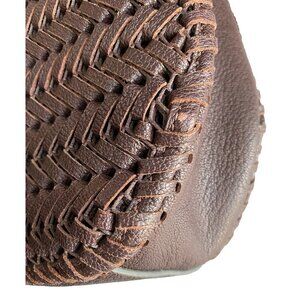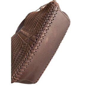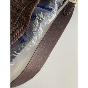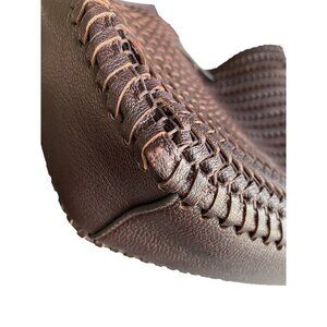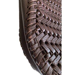 Handwoven in smooth, supple leather, this bag features the Neeson’s distinctive chevron pattern and a structured silhouette with soft drape. The rich rosewood brown hue (deep chocolate with warm burgundy undertones) pairs beautifully with brass hardware and tonal tassel ties.