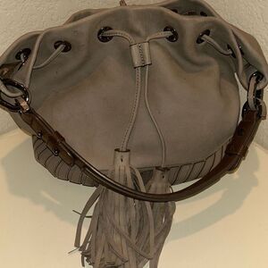 Anya Hindmarch Taupe Brown Leather Bucket Bag Tassel Fringe Purse Boho Western
