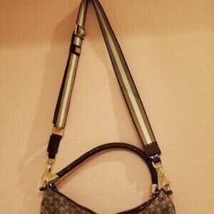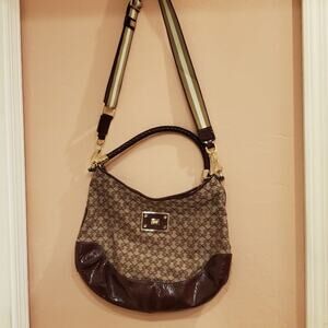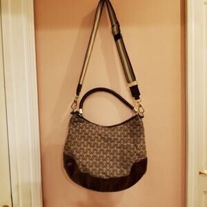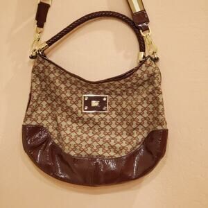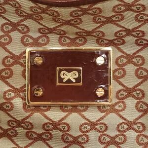 Anya Hindmarch canvas leather shoulder bag tote. Pre-owned, very good shape. Clean in and out. Signature/Monogram pattern. Magnetic closure. 2 internal pockets -zipped and open. Key ring inside. Size 15x12". Small handle drop 6", shoulder handle 21", adjustable. Golden tone hardware.
