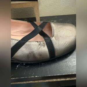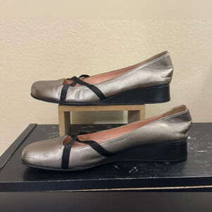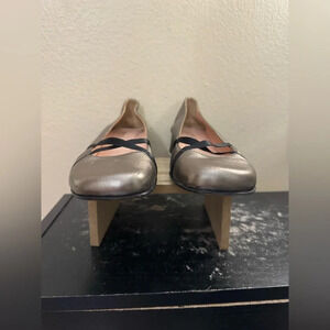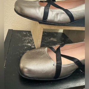 This is a listing for a pair of preowned Anyi Lu Pewter Leather Criss Cross Straps Shoes EU 40 US 9-9.5 Mini Wedge. The shoes have a couple of scuffs in leather, not sure if a polish would help this. Otherwise good condition. Please see all photos for details as they are part of the description.