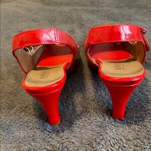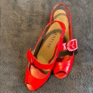 These striking red heels from Anyi Lu feature a glossy patent leather finish and a chic peep-toe design. The slingback style with an ankle strap ensures a secure fit, while the high heel adds elegance to any formal event.