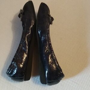 Black reptile leather upper w/ embellished tie at upper Open toe Ballet style at ankle