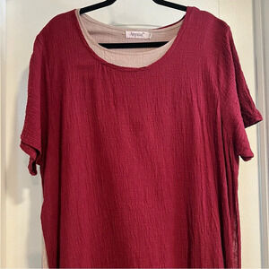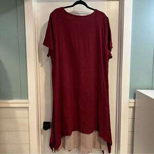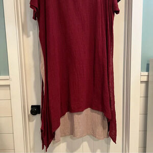 Anysize Burgundy & Tan Linen Cotton Gauze Lagenlook Layered Dress. OS.