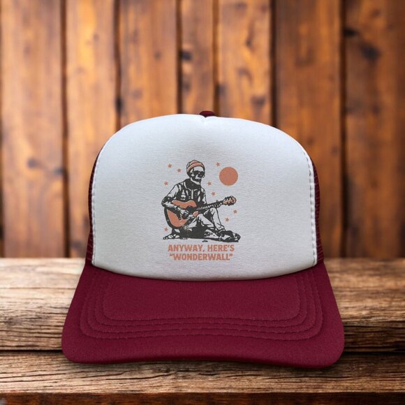 Anyway Here's Wonderwall Oasis Mens Trucker Hat Maroon Beginner Guitar Funny