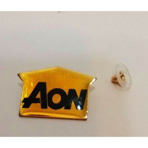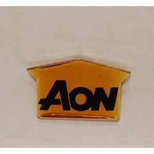 Aon pin in the shape of a house with black letters.
