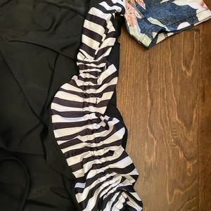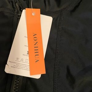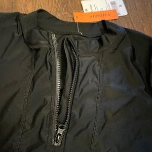 Aonihua Ruched Rash guard Black Floral Short Sleeve & Ruched Side Stripes with front zipper. Womens Size Small stretch-enhanced ruched side gives a perfect two way rash guard or coverup dress.Perfect for summer beach or boating day. stretch material - underarm to underarm lying flat 17" unstretched.