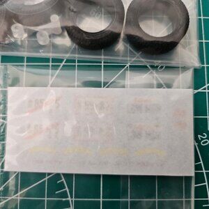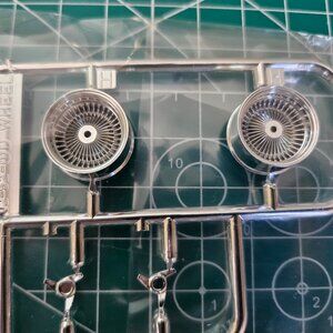 Silver wire rims w/ center 3-prong hub and Pirelli low profile tires. Includes a decal sheet for plates and tires.