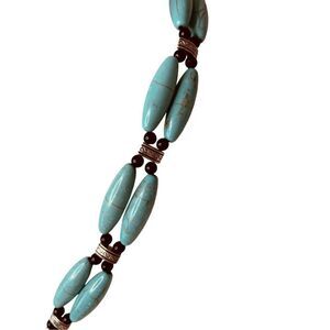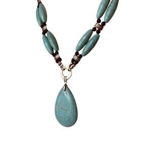Apache Style Imitation Turquoise Pregnant Necklace Macing Earrings. Length is approximately 20" long plus 3" extension. Pendant drop including basil is approximately 2.5" by 1.25"W. Earring drop is approximately 1.5". Item in excellent condition. No known rips, tears, holes, stains or defects.