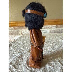 This charming doll tells a tale of tradition and artistry, adorned in a detailed faux leather outfit with beaded accents, celebrating Apache heritage.