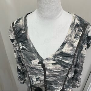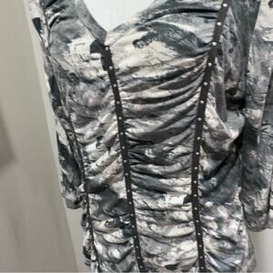Apanage Grey and White Ruched 3/4 Sleeve Top Size 14 V-Neck Studded Tee