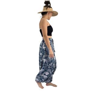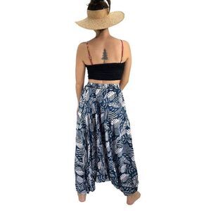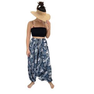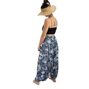 Apau ~ Gender Fluid Alladin Gypsy Pants Blue White Tropical Floral Leaf Design