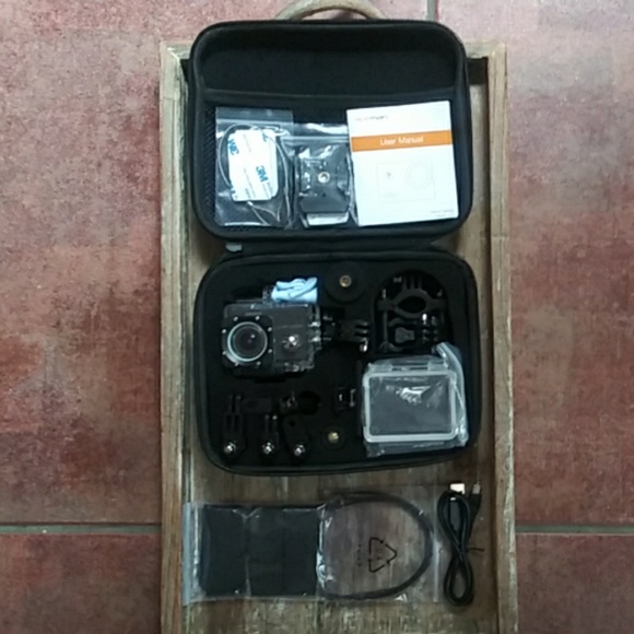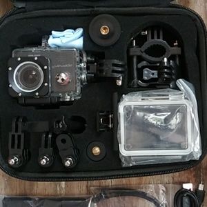Capture all your adventures with this all-in-one camera set. Waterproof up to 30 m. Built-in Wi-Fi and easy control. 170 degree wide angle and long lasting battery life. New in original case.