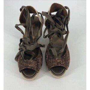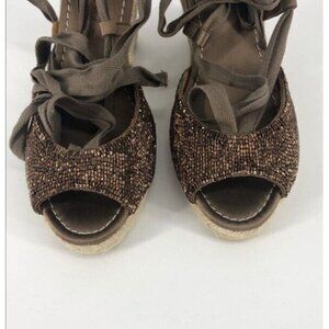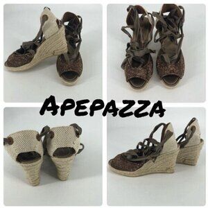 Apepazza brown and tan espadrille wedges. Brown beaded open toe. Canvas back. Brown lace up canvas straps. 4" heel with 1" platform. Size 39