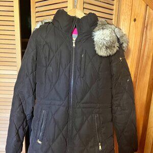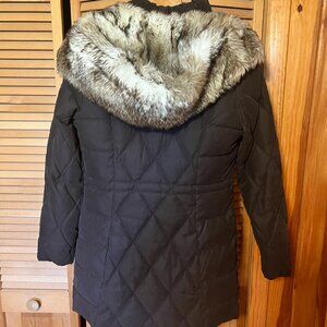 Great warm winter coat with fur hood! Size small, it is a dark brown color. It is very thick and great for a cold winter.