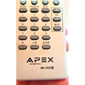 Apex Digital RM-2600 Remote Control Tested Working J5-5. This remote has been cleaned and tested. The batteries have been removed and it will be shipped without them. Please see pictures for more details.