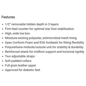 The design includes a moisture wicking antimicrobial mesh lining and soft padded collar. The footbed can also be removed and replaced with your own custom orthotics, allowing you to utilize the double depth feature. Apex's polyurethane soles will give you the stability and safety you need, giving you confidence in every step you take.