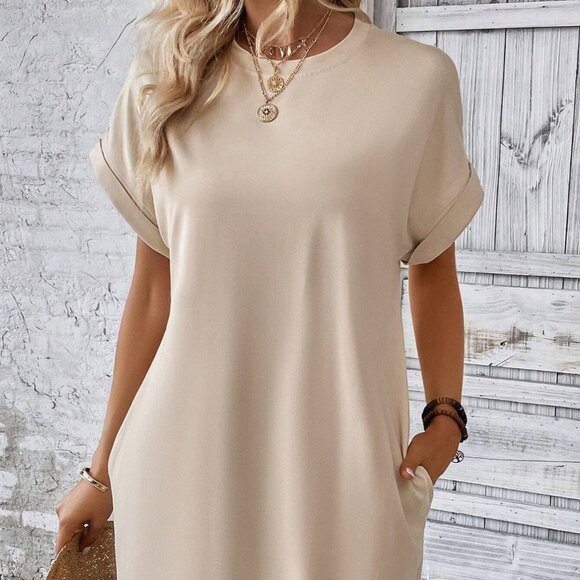 Apicot Orange Boho Womens Solid Batwing Sleeve Hidden Pocket Tee Dress