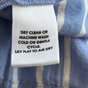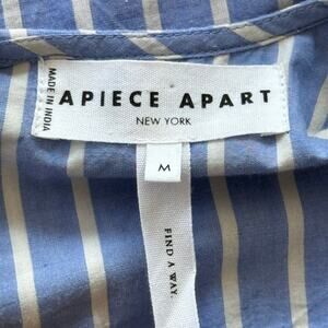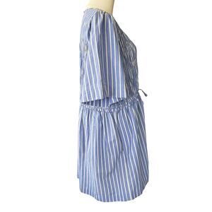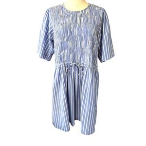 Apiece Apart Adorna Smocked Striped Cotton Mini Dress in Blue and White. Size Medium. Features smocked bodice, fluttery elbow length sleeves, polished stripes, and jewel neck. Unlined. Fabric: 100% Organic Cotton. Excellent pre-owned condition. Retails $325.