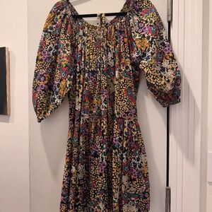 Knee-length, floral print Apiece Apart Davina Mini Dress with drop waist and elastic neckline for off-shoulder option. Size Medium, fit is loose. Worn once, in excellent condition. Original fabric belt included.