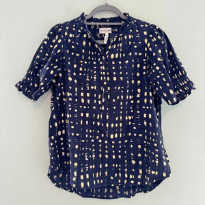 Partial button closure, straight silhouette with high-low shirt tail hem, puff-sleeve with elastic at cuff, banded collar with ruffle detail