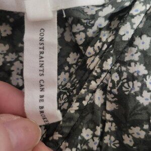Gathered v-neckline, top-to-bottom snap closure, full flowy skirt