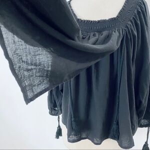 Has a panel in front shown in picture. Tassel sleeves. This is size 0. But this top is very flowy and lots of room to give. Will prob fit size 2 or Small. Very Lightweight. Ruched collar.