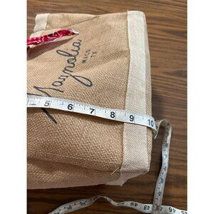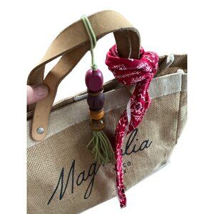 Apolis Global Citizen burlap short double handled bag with Magnolia Waco, TX on front. Inside coated in pkastic. Has inside pocket. Red bandana. Beaded charm. Back reads: Type:BD-ML035N-OS NFG: Apolis Global Citizen Issue: Market Bag Origin: Bangladesh Project Factory Code: Ban-Lat-7099/Lon90.4071 Org: Saidpur Bangladesh. RN#118254
