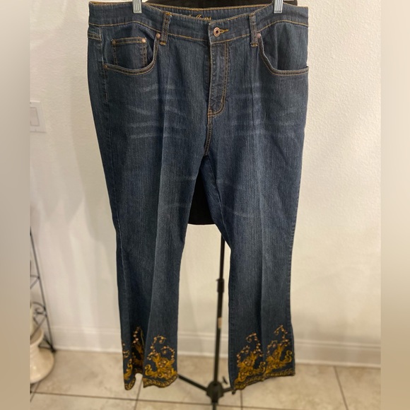 Apollo high rise jeans with rose gold embroidered bottoms and back pockets. Waist 18” length 43” rise 11.5” inseam 32”