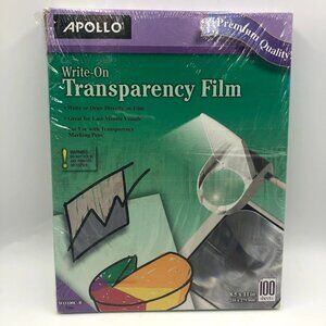 Apollo Write On Transparency Clear Film for Markers Box Open Box. Box has a few dents on corners but is in original plastic - it is taped up but unsure if because was fully opened (doesn't appear to be) or just re-taped the plastic. Thing is the box feels full but full disclosure there could potentially be a couple missing - full box is 100 sheets so must be somewhere around that number. I did not re-open the box to count each individual sheet to keep the integrity of the box intact. Clear. 8.5 x 11 inches. WO100C-B. Write or draw directly on film, great for last minute visuals, and for use with transparency marking pens according to the directions. Please feel free to message with questions.