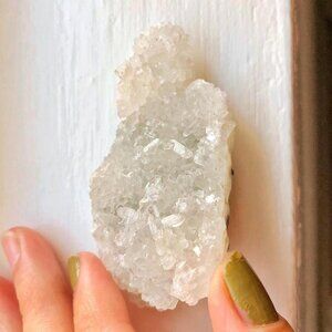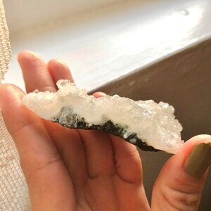 A small, stunning piece filled with micro apophyllite crystals with calcite inclusions on an earthy blue undertone matrix.