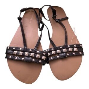 These black sandals feature multiple thin straps and an open-toe design, making them a stylish choice for warm weather. The front strap is adorned with small silver-colored metallic studs, adding a touch of elegance. An adjustable ankle strap ensures a secure fit. Please see all pictures.