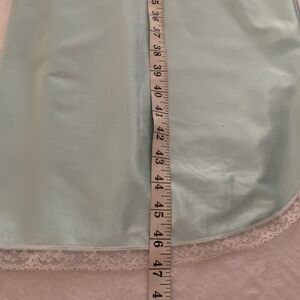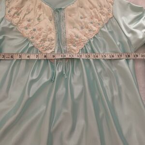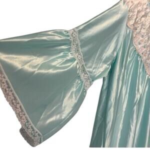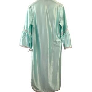 This stunning blue gown by Apostrophe is a vintage deadstock piece that will add a touch of romance and elegance to your sleepwear collection. Featuring a beautiful floral lace pattern, 3/4 ruffle sleeves, and a V-neckline, this gown is perfect for any season and is easy to care for with its machine washable polyester material. The pullover closure and partial button front add to the classic and shabby chic style of this gown, while the thin and lightweight fabric makes it easy to pack and wear in any season. The size 8 regular fit and roomy A-line make this gown comfortable and perfect for any body type, while the washable shirt tail hemline and packable design add to its practicality. This gown is perfect for anyone who loves the USA, colorful and romantic themes, and classic and retro styles. Add a touch of Belle from Frozen to your wardrobe with this stunning Apostrophe gown.