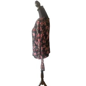 Add a touch of boho charm with this Apostrophe Juniors floral long sleeve top! Features a beautiful pink and coral floral pattern on a black background, with a flattering V-neck and soft stretch fabric. Women’s/Juniors size Large 14/16. Excellent condition. Perfect for layering or standout everyday style.