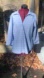 Lovely light blue color, stretchy but crisp cotton blend fabric. So pretty and versatile. Deep V neck, button front, 3/4 length sleeves, longer tunic length.