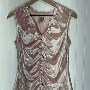 Apostrophe Stretch top | Ruched velvet tank | Y2K glam aesthetic | Blush pink shirt | Coquette style | Soft girl vibe | Vintage 2000s top | Sleeveless v-neck blouse | Medium size (10–12) | Made in Northern Mariana Islands | 90s/00s throwback | Shiny crushed velvet | Polyester spandex blend