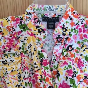 Pretty floral print featuring fuchsia, yellow, black, coral, green and white. Very fitted bodice with pleating at bust and princess seams front and back. Unique style with gathered sleeves and Mandarin collar. Silver tone buttons. 96% cotton 4% spandex