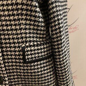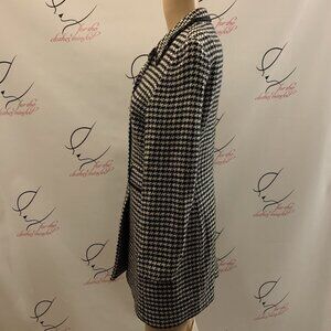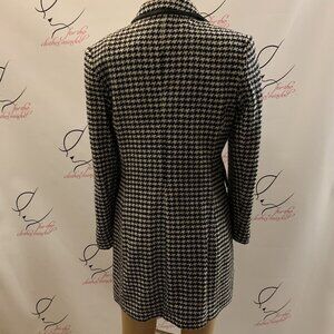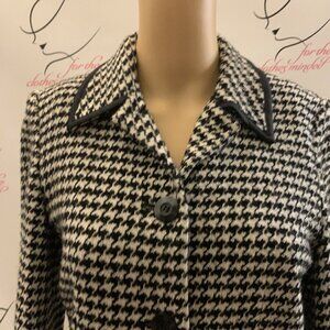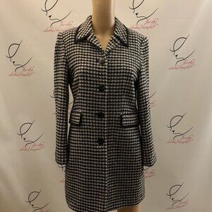 Apostrophe. Sz 4. Wool/Rayon/Spandex Blend Lined Coat. Faux Pockets. Houndstooth. Lining is polyester. Faux pockets. Center back 31.5". Sleeve 22.5". Bust 35". Excellent pre-loved condition. No spots, tears or damage.