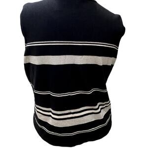 Sleeveless Black Sweater with Silver accents works well paired with a black cardigan or blazer. Stretchy knit fabric makes it very easy to wear. Great holiday seasonal wear.