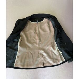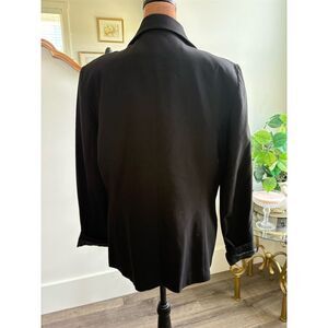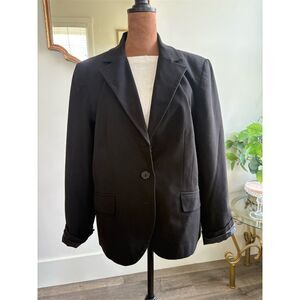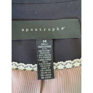 Elevate your wardrobe with the Apostrophe Blazer, a versatile piece that effortlessly transitions from business meetings to casual outings. Crafted from a blend of polyester, rayon, and spandex, this black blazer offers a tailored fit that flatters your silhouette. The mid-length design and long sleeves provide a polished look, while the two-button closure adds a touch of sophistication. Perfect for any occasion, this blazer is machine washable for easy care. This item is pre-owned, offering you style and sustainability in one chic package.