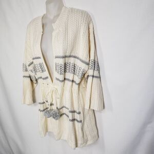 Apostrophe Womens Cardigan Sweater Large Pom Pom Cream Gray Tie Front 3/4 Sleeve