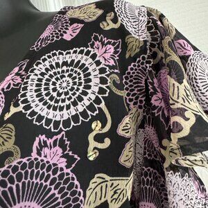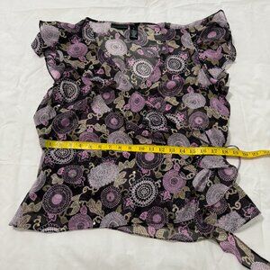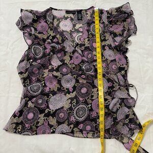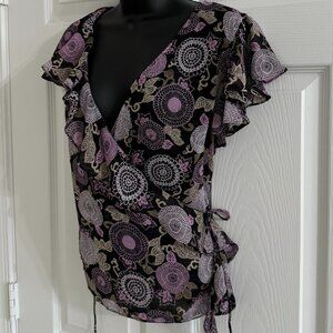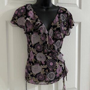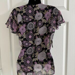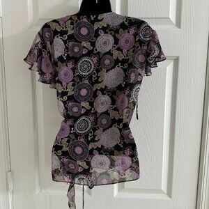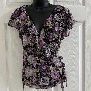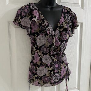 Cap Sleeve, Wrap Top, Sequin Floral, Purple/Black Polyester.